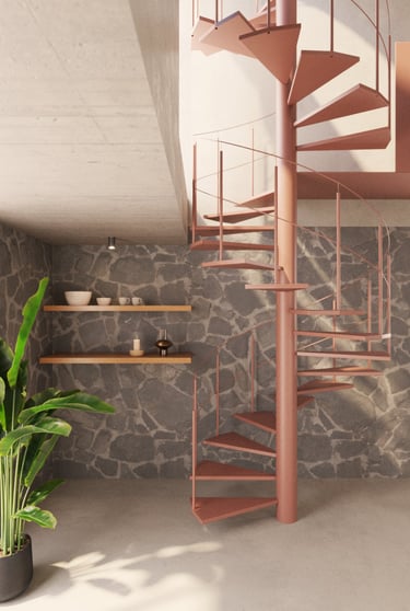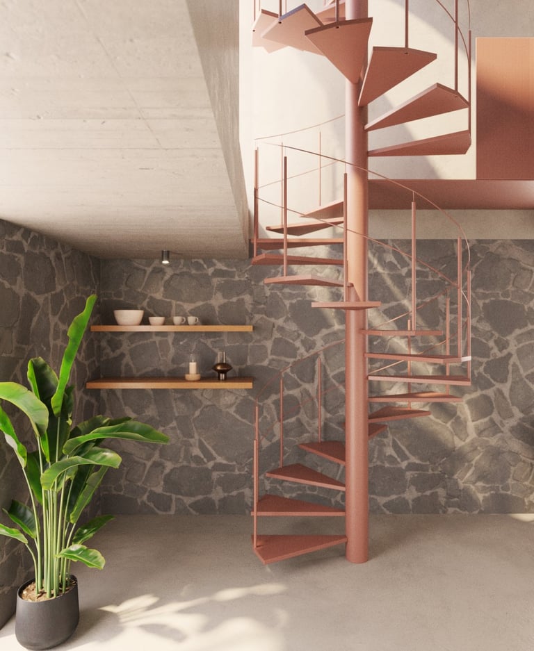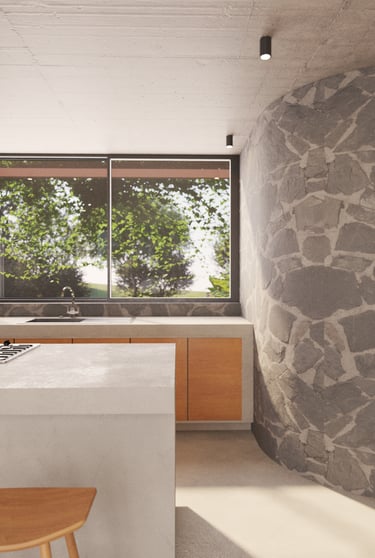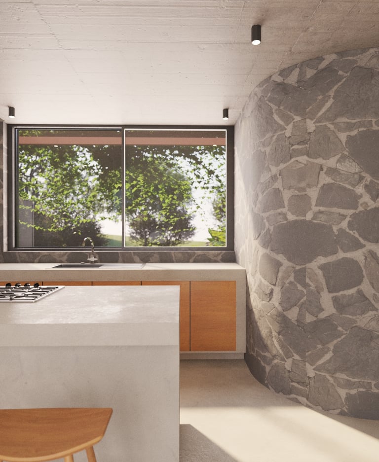 En la planta baja, lo terrenal se manifiesta a través de espacios sociales abiertos (sala, comedor, cocina y estudio) que conectan directamente con el suelo y el jardín. La materialidad se ancla en la piedra y el concreto, evocando solidez, arraigo y permanencia.