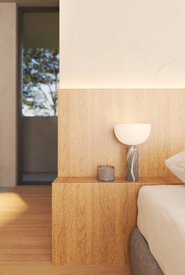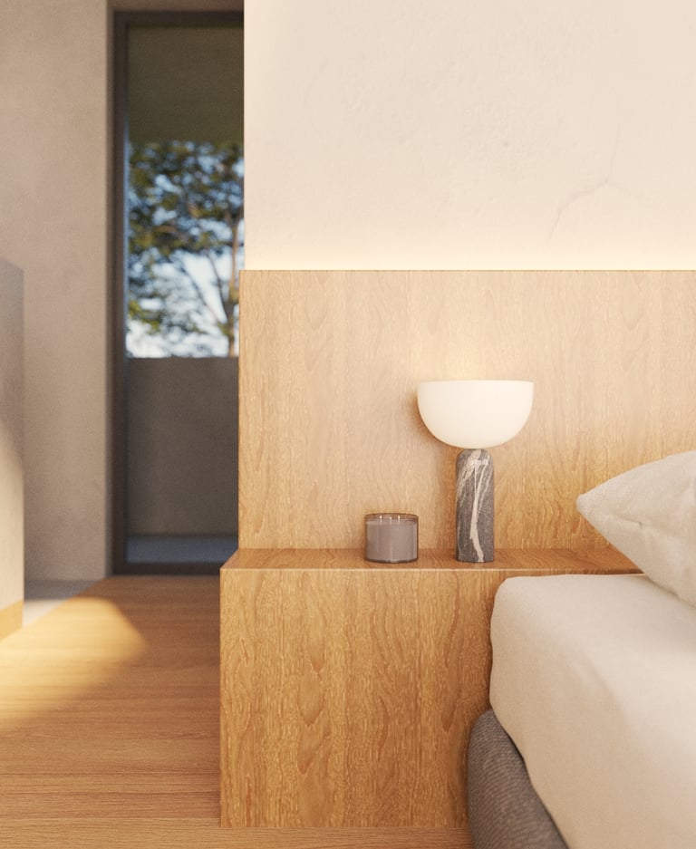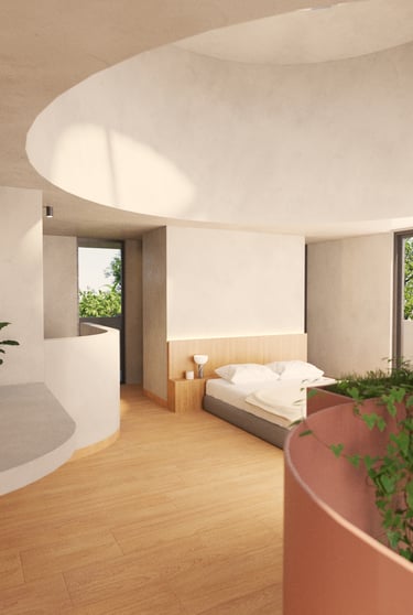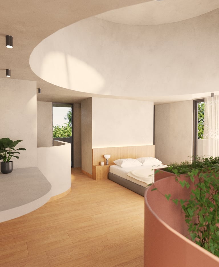 La segunda planta representa la transición, el umbral entre lo público y lo íntimo. Aquí se alojan las áreas privadas, concebidas como refugios que permiten el descanso y la introspección. El concreto adquiere una cualidad más plástica y contenida, acompañando el carácter introspectivo del nivel.