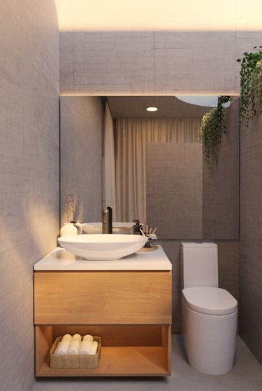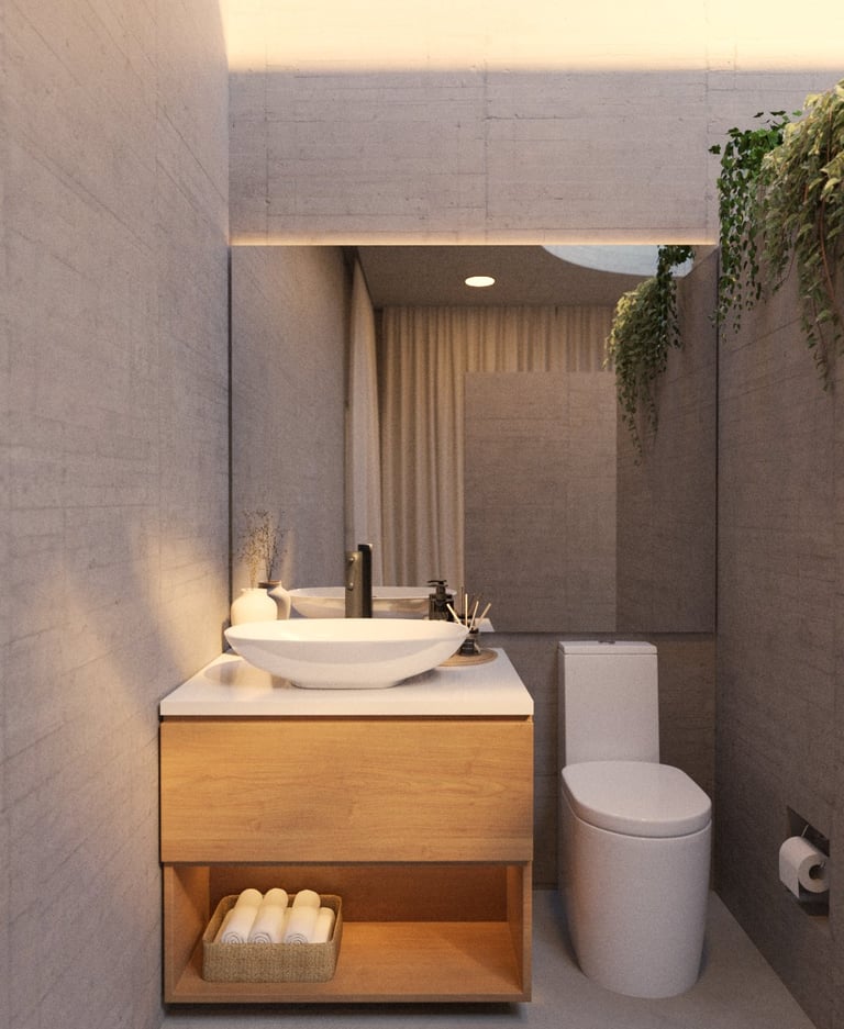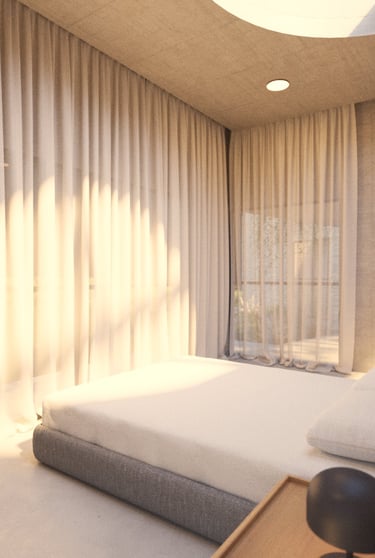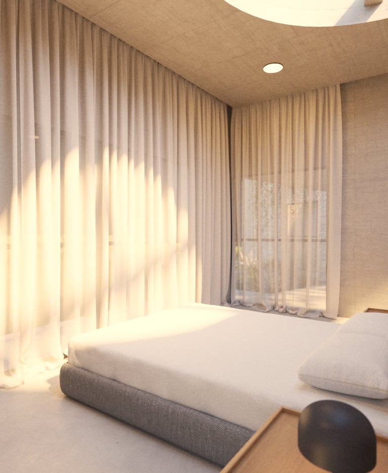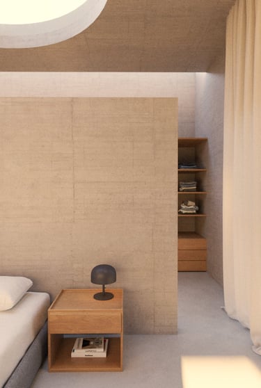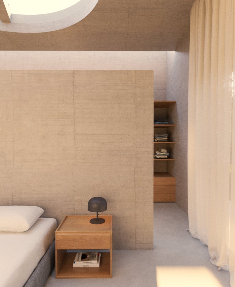 El segundo volumen contiene la zona privada: habitación y baños. Separado del principal, ofrece independencia e intimidad, y se abre a la luz a través de vanos cenitales y ventanales que permiten una relación directa con la naturaleza.