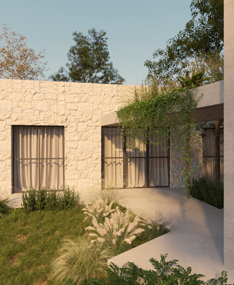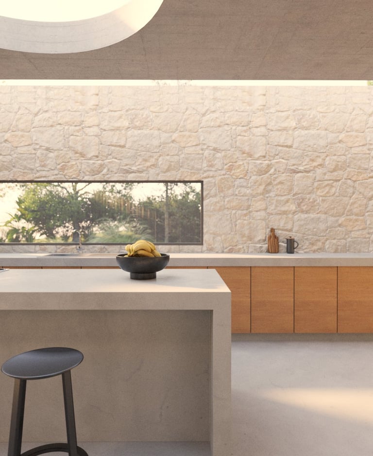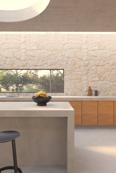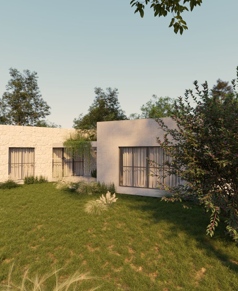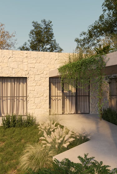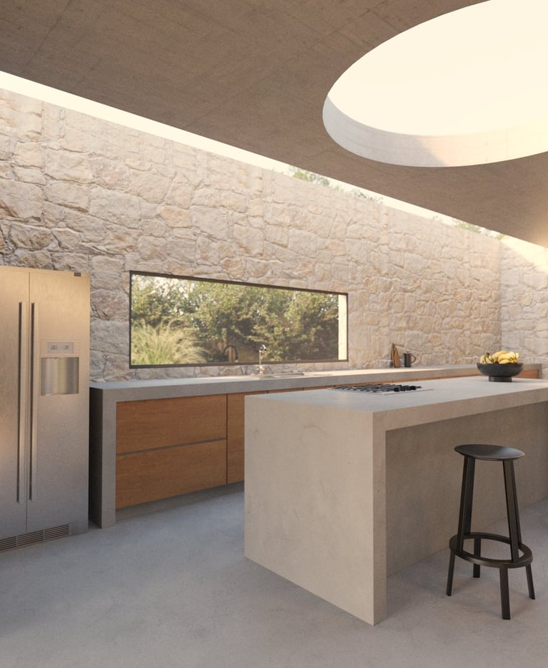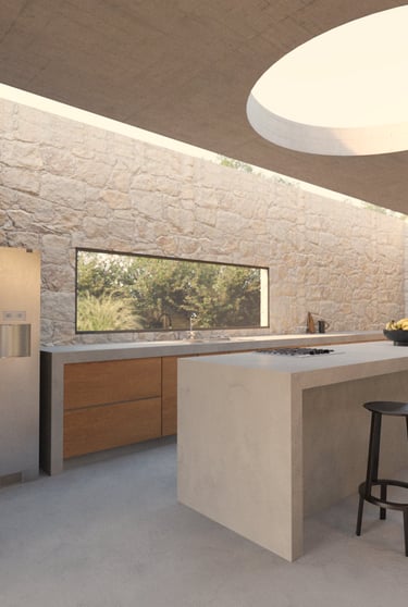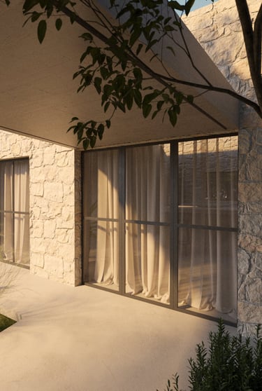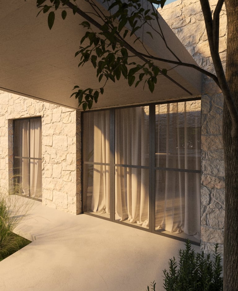 Refugio Mila surge del diálogo entre dos volúmenes que encuentran en la materialidad su anclaje al terreno. La piedra se convierte en mediadora entre arquitectura y paisaje, enraizando la obra en su entorno y ofreciendo al mismo tiempo protección e introspección.