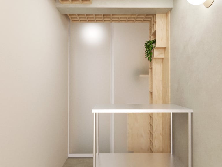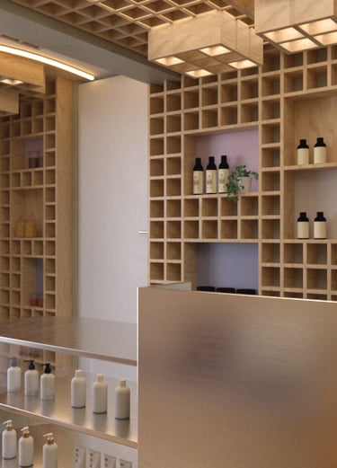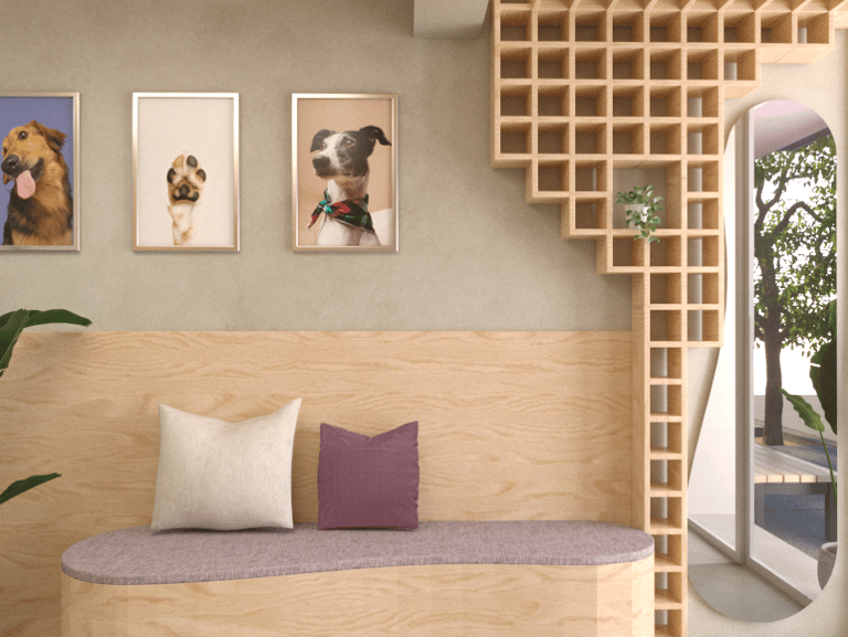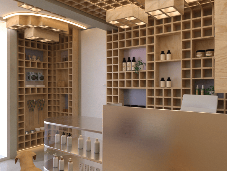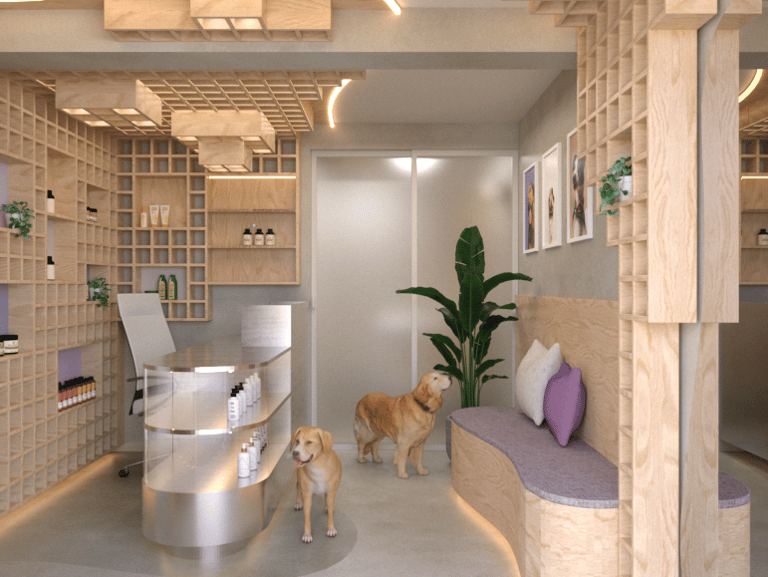 La investigación nos llevó a los cristales de cuarzo amatista, reconocidos por su asociación con calma y equilibrio. Su estructura molecular inspiró el diseño del mobiliario, que se despliega en planos facetados y genera recorridos que funcionan como “cuevas” contenidas, lugares donde las mascotas pueden sentirse protegidas durante la espera o la revisión.